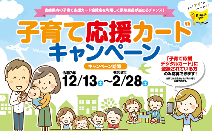 宮崎県内にお住まいで、高校生以下のお子様と妊娠中の方のいるご家庭に交付するカードです。協賛店でカードを提示すると、割引など各協賛店で様々なサービスが受けられます。カードをお持ちでない方は、当サイトで新規登録のうえ、デジタルカードを取得するか、お住まいの市町村窓口で紙カードをお受け取りください。